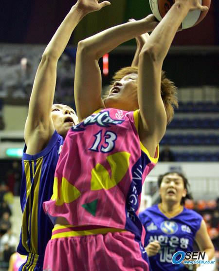 27일 서울 장충체육관에서 벌어진 2006 금호아시아나배 여자 프로농구 겨울리그 중립경기 신한은행과 신세계전에서 신세계의 김정은(180cm)이 신한은행 전주원(176cm)의 마크를 받으며 골밑슛을 날리고 있다./장충체=주지영 기자 jj0jj0@osen.co.kr [Copyright ⓒ 한국 최고의 스포츠 전문 미디어 OSEN(www.osen.co.kr) 무단전재 및 재배포 금지]