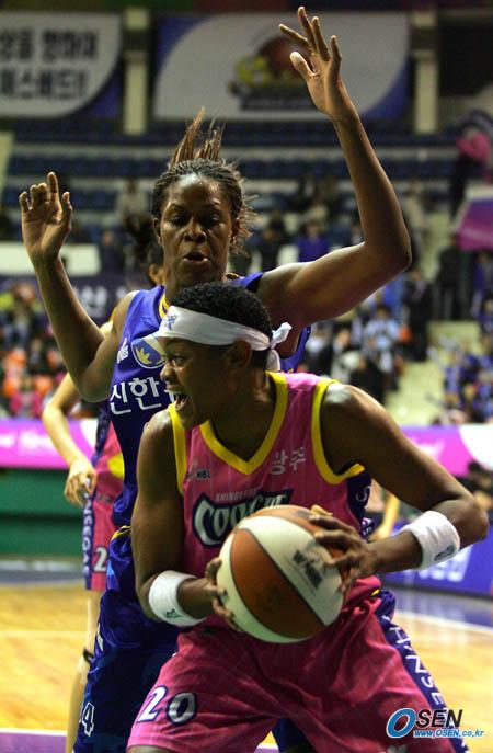 27일 서울 장충체육관에서 벌어진 2006 금호아시아나배 여자 프로농구 겨울리그 중립경기 신한은행과 신세계전에서 신세계의 비어드(오른쪽)가 신한은행 맥윌리엄스의 마크를 받으며 골밑서 기회를 엿보고 있다./장충체=주지영 기자 jj0jj0@osen.co.kr [Copyright ⓒ 한국 최고의 스포츠 전문 미디어 OSEN(www.osen.co.kr) 무단전재 및 재배포 금지]