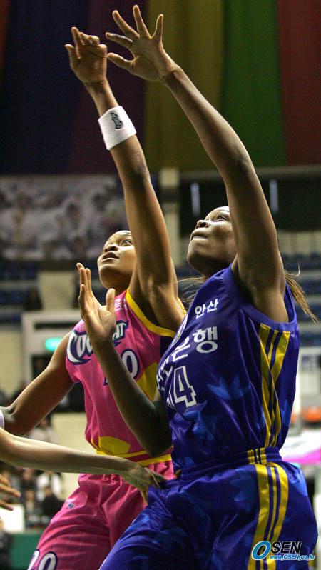 27일 서울 장충체육관에서 벌어진 2006 금호아시아나배 여자 프로농구 겨울리그 신한은행-신세계전 후반 신세계의 비어드(왼쪽)와 신한은행의 맥윌리엄스가 리바운드를 다투는 순간 누군가가 맥윌리엄스의 트렁크를 슬쩍 잡고 있다./장충체=주지영 기자 jj0jj0@osen.co.kr [Copyright ⓒ 한국 최고의 스포츠 전문 미디어 OSEN(www.osen.co.kr) 무단전재 및 재배포 금지]