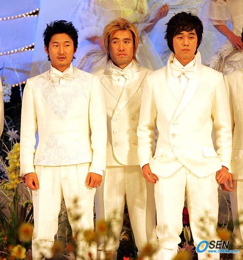 2005 삼성 하우젠 K리그 대상 시상식이 28일 오후 서울 홍은동 그랜드 힐튼호델 컨벤션룸에서 열렸다. 시상식이 시작되기 전 베스트11에 뽑힌 선수들이 앙드레 김의 옷을 입고 여성 모델들과 패션쇼를 갖는 자리서 이천수 김병지 박주영이 멋진 폼으로 서 있다./손용호 기자 spjj@osen.co.lkr [Copyright ⓒ 한국 최고의 스포츠 전문 미디어 OSEN(www.osen.co.kr) 무단전재 및 재배포 금지]