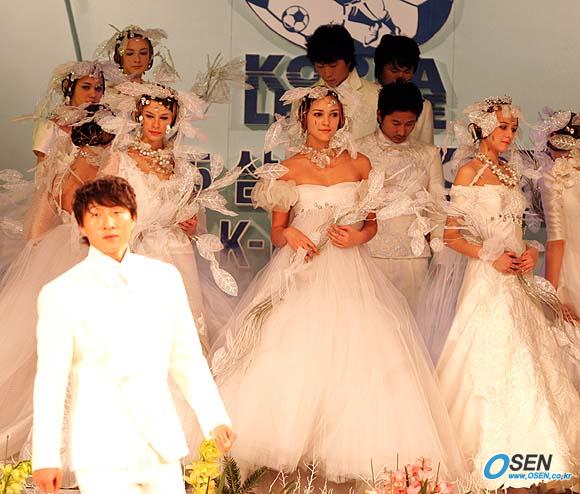 2005 삼성 하우젠 K리그 대상 시상식이 28일 오후 서울 홍은동 그랜드 힐튼호델 컨벤션룸에서 열렸다. 시상식이 시작되기 앞서 베스트 11에 뽑힌 선수들이 앙드레 김의 옷을 입고 여성 모델들과 패션쇼를 가졌다./손용호 기자 spjj@osen.co.lkr [Copyright ⓒ 한국 최고의 스포츠 전문 미디어 OSEN(www.osen.co.kr) 무단전재 및 재배포 금지]