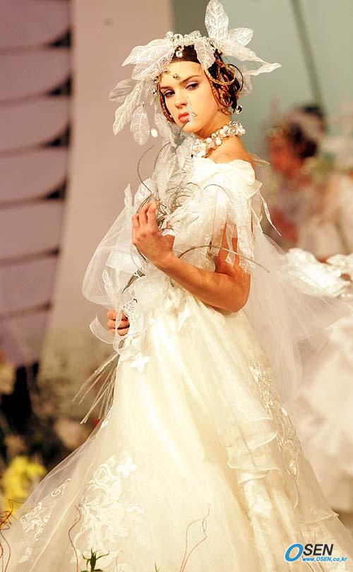 2005 삼성 하우젠 K리그 대상 시상식이 28일 오후 서울 홍은동 그랜드 힐튼호델 컨벤션룸에서 열렸다. 본격적인 시상식이 열리기 전 앙드레 김의 옷을 입은 선수들과 모델이 패션쇼를 가졌다. 외국인 여성 모델이 웨딩드레스를 입고 아름다운 자태를 뽐내고 있다./손용호 기자 spjj@osen.co.lkr [Copyright ⓒ 한국 최고의 스포츠 전문 미디어 OSEN(www.osen.co.kr) 무단전재 및 재배포 금지]