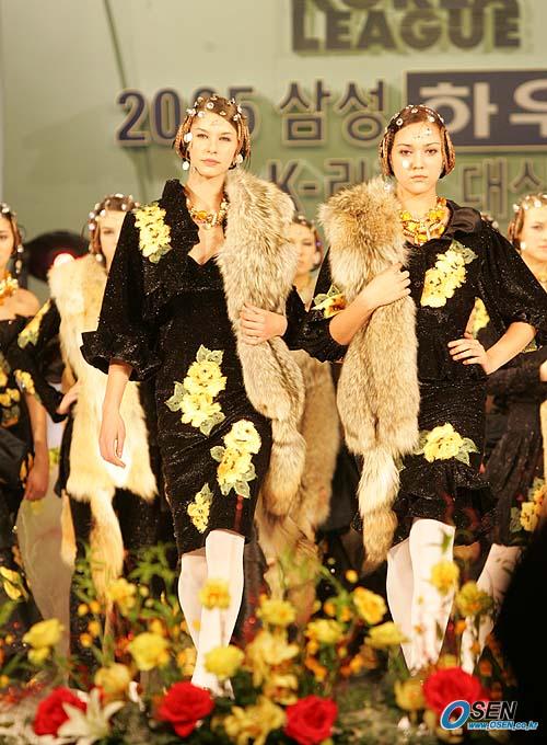 2005 삼성 하우젠 K리그 대상 시상식이 28일 오후 서울 홍은동 그랜드 힐튼호델 컨벤션룸에서 열렸다. 본격적인 시상식이 열리기 전 앙드레 김의 옷을 입은 선수들과 여성 모델이 패션쇼를 가졌다. 모델들이 멋진 포즈로 워킹하고 있다./손용호 기자 spjj@osen.co.lkr [Copyright ⓒ 한국 최고의 스포츠 전문 미디어 OSEN(www.osen.co.kr) 무단전재 및 재배포 금지]
