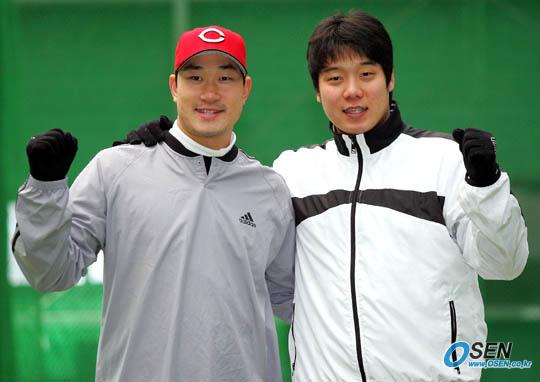 서울 덕수정보산업고에서 함께 훈련 중인 신시내티 레즈의 봉중근과 시카고 컵스의 유제국이 28일 오후 훈련을 공개하고 합동 인터뷰를 가졌다. 봉중근(왼쪽)과 유제국이 새해를 앞두고 파이팅을 외치고 있다./주지영 기자 jj0jj0@osen.co.kr [Copyright ⓒ 한국 최고의 스포츠 전문 미디어 OSEN(www.osen.co.kr) 무단전재 및 재배포 금지]