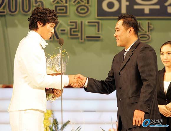 2005 삼성 하우젠 K리그 대상 시상식이 28일 오후 서울 홍은동 그랜드 힐튼호델 컨벤션룸에서 열렸다. K-리그 개인 통산 최다득점 기록을 경신하고 은퇴한 김도훈이 종전 기록 보유자인 김현석 울산 현대 코치(오른쪽)로부터 공로상을 받으며 악수를 나누고 있다./손용호 기자 spjj@osen.co.lkr [Copyright ⓒ 한국 최고의 스포츠 전문 미디어 OSEN(www.osen.co.kr) 무단전재 및 재배포 금지]