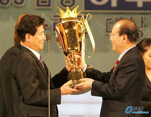2005 삼성 하우젠 K리그 대상 시상식이 28일 오후 서울 홍은동 그랜드 힐튼호델 컨벤션룸에서 열렸다. K-리그 우승을 차지한 울산 현대의 김정남 감독에게 곽정환 프로축구연맹회장(오른쪽)이 우승컵을 전달하고 있다./손용호 기자 spjj@osen.co.lkr [Copyright ⓒ 한국 최고의 스포츠 전문 미디어 OSEN(www.osen.co.kr) 무단전재 및 재배포 금지]