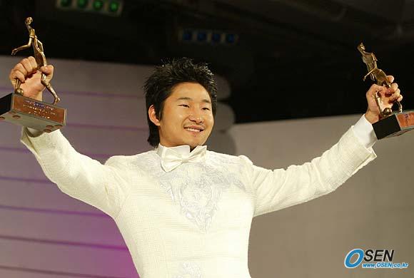 2005 삼성 하우젠 K리그 대상 시상식이 28일 오후 서울 홍은동 그랜드 힐튼호델 컨벤션룸에서 열렸다. MVP로 선정된 이천수가 베스트 11상을 포함 두 개의 트로피를 높이 쳐들고 있다./손용호 기자 spjj@osen.co.lkr [Copyright ⓒ 한국 최고의 스포츠 전문 미디어 OSEN(www.osen.co.kr) 무단전재 및 재배포 금지]