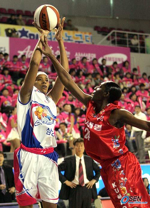 30일 용인체육관에서 벌어진 2006 금호아시아나배 여자 프로농구 겨울리그 용인 삼성생명과 구리 금호생명의 경기서 삼성생명이 70-65로 역전승했다. 1쿼터서 삼성생명 스미스의 슛을 금호생명 겐트가 블로킹을 하려다 손을 치는 파울을 범하고 있다./용인=손용호 기자 spjj@osen.co. [Copyright ⓒ 한국 최고의 스포츠 전문 미디어 OSEN(www.osen.co.kr) 무단전재 및 재배포 금지]