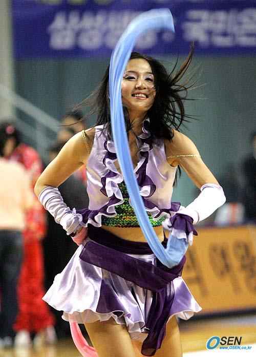 30일 용인체육관에서 벌어진 2006 금호아시아나배 여자 프로농구 겨울리그 용인 삼성생명과 구리 금호생명의 경기서 삼성생명이 70-65로 역전승했다. 작전 타임 때 치어리더들이 리본을 이용한 퍼포먼스를 선보이고 있다./용인=손용호 기자 spjj@osen.co. [Copyright ⓒ 한국 최고의 스포츠 전문 미디어 OSEN(www.osen.co.kr) 무단전재 및 재배포 금지]
