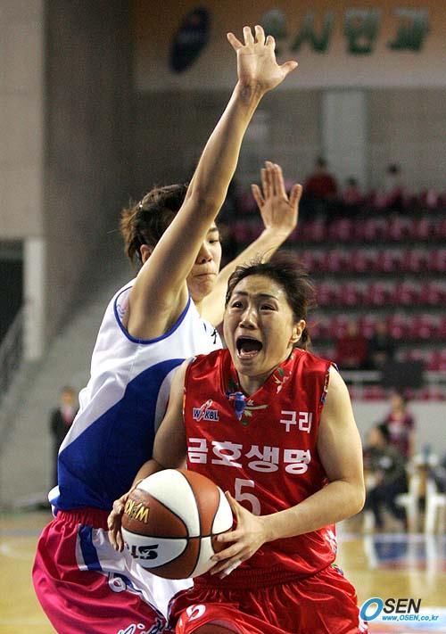 30일 용인체육관에서 벌어진 2006 금호아시아나배 여자 프로농구 겨울리그 용인 삼성생명과 구리 금호생명의 경기서 삼성생명이 70-65로 역전승했다. 3쿼터 금호생명의 김지윤이 삼성생명 김세롱을 제치고 레이업슛을 시도하고 있다./용인=손용호 기자 spjj@osen.co. [Copyright ⓒ 한국 최고의 스포츠 전문 미디어 OSEN(www.osen.co.kr) 무단전재 및 재배포 금지]