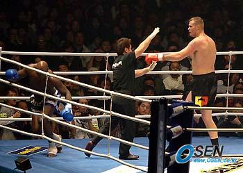 신구 챔피언간의 대결에서 올해 K-1 월드 그랑프리 챔피언 세미 쉴트(네덜란드)가 승리를 따내 '전성시대'를 예고했다. 쉴트는 31일 일본 오사카돔에서 열린 'K-1 다이너마이트' 8경기에서 월드 그랑프리 4회 우승에 빛나는 어네스트 호스트(네덜란드)를 맞아 2라운드 TKO로 물리쳤다. 지난 2002년 1회 다이너마이트에서 호스트와 무승부를 기록했던 현 챔피언 쉴트는 41세의 백전 노장 호스트에 승리를 맞아 완승을 따내 K-1 세대 교체의 신호탄을 알렸다. 쉴트는 펀치와 로킥을 호스트와 주고 받으면서 1라운드를 넘긴 뒤 2라운드들어 니킥을 호스트의 안면에 적중시켜 다운을 빼앗았고 이어 심판이 호스트의 출혈이 심하다고 판단해 TKO 선언, 승리를 따냈다. 쉴트는 경기 직후 "계획대로 경기가 풀렸고 승리하게 되서 매우 기쁘다. 니킥을 명중시켰을 때 KO시킬 정도는 아니었다고 생각했는데 심판이 경기를 중단시켜 경기가 끝나게 됐다"고 소감을 밝혔다. 월드 그랑프리 3회 우승의 피터 아츠(네덜란드)는 1경기에서 1라운드 경기 시작 31초만에 오마야 순고(일본)에 힐 홀드(heel hold.발꿈치 꺾기)로 탭 아웃을 내줘 이변의 희생양이 됐고 2경기에 나선 제롬 르 밴너(프랑스)가 2라운드 중반 TKO로 알란 카라예프(러시아)에 승리를 거뒀다. 올해 월드 그랑프리 4강에서 쉴트에 패해 자존심을 구겼던 2003, 2004년 챔피언 레미 보냐스키(네덜란드)는 5경기에서 더 프레데터(미국)에 펀치 세례를 맞는 등 고전을 면치 못한 끝에 2-1로 간신히 판정승을 받아냈다. 일본의 에이스 무사시는 6경기에서 한 차례씩 다운을 주고 받는 난타전 끝에 '야수' 밥 샙(미국)을 심판 전원 일치 판정승을 올렸다. 제3경기에서는 노 콘테스트가 나왔다. 경기 시작 전 심판이 주의사항을 일러주는 사이 나가오 요시히로(일본)가 히스 헤링(미국)에 입맞춤을 하자 헤링이 펀치를 날려 나가오를 캔버스에 눕혔고 이에 경기가 무산되는 해프닝이 일어났다. K-1 무대 데뷔전을 치른 나가타 가쓰히코(일본)는 제 4경기에서 레미기우스 모르케비치우스(리투아니아)를 맞아 3-0 판정승을 거뒀다. ◆ 2005 K-1 다이너마이트(왼쪽이 승자) ▲제1경기(히어로스 룰/종합격투기 룰.이하 동일) 오야마 순고(일본) 피터 아츠(네덜란드) ▲제2경기 제롬 르 밴너(프랑스) 알란 카라예프(러시아) ▲제3경기 나가오 요시히로(일본) 히스 헤링(미국) ▲제4경기 나카타 가쓰히코(일본) 레미기우스 모르케비치우스(리투아니아) ▲제5경기 (K-1 룰/입식타격기 룰.이하 동일) 레미 보냐스키(네덜란드) 더 프레데터(미국) ▲제6경기 무사시(일본) 밥 샙(미국) ▲제7경기 마사토(일본) 오히가시 아키라(일본) ▲제8경기 세미 쉴트(네덜란드) 어네스트 호스트(네덜란드) 글, 국영호 기자 iam905@osen.co.kr 사진, 오사카=송석린 기자song@osen.co.kr [Copyright ⓒ 한국 최고의 스포츠 전문 미디어 OSEN(www.osen.co.kr) 무단전재 및 재배포 금지]