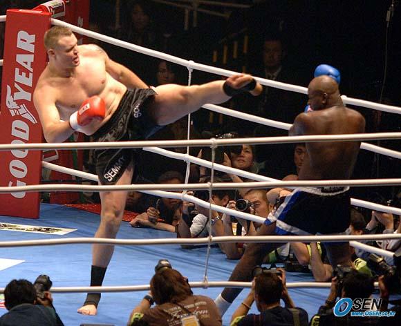 2005년을 마무리하는 K-1 다이너마이트 대회가 12월 31일 오사카돔에서 열렸다. 제8경기 세미 쉴트(네덜란드) - 어니스트 호스트(네덜란드) 의 경기서 세미 쉴트의 하이킥을 호스트가 피하고 있다.세미 쉴트는 2라운드 35초만에 TKO 승을 거두었다. /오사카=송석린 기자 song@osen.co.kr [Copyright ⓒ 한국 최고의 스포츠 전문 미디어 OSEN(www.osen.co.kr) 무단전재 및 재배포 금지]