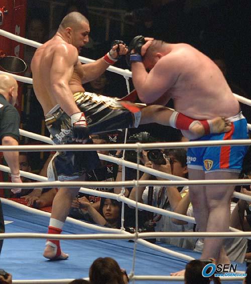 2005년을 마무리하는 K-1 다이너마이트 대회가 12월 31일 오사카돔에서 열렸다. 제2경기서 제롬 르 밴너(프랑스)가 알란 카라예프(러시아)에 2라운드 1분 14초 만에 KO승을 거두었다. 르 밴너가 카라예프에게 강력한 미들킥을 옆구리에 적중시키고 있다./오사카=송석린 기자 song@osen.co.kr [Copyright ⓒ 한국 최고의 스포츠 전문 미디어 OSEN(www.osen.co.kr) 무단전재 및 재배포 금지]