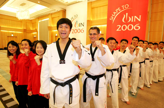 지난 4일(수) 오전에 인천 하얏트 리젠시 호텔에서 2004 아테네 올림픽 태권도 금메달리스트인 문대성(맨앞)과 한국노바티스 임직원들이 태권도 수련과 함께 시무식을 가졌다. 문대성과 노바티스 임직원들이 함께 하얀 도복을 입고 기합소리와 함께 새해 출발을 다짐하고 있다. /플레시먼힐러드코리아 제공 [Copyright ⓒ 한국 최고의 스포츠 전문 미디어 OSEN(www.osen.co.kr) 무단전재 및 재배포 금지]