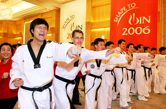 지난 4일(수) 오전에 인천 하얏트 리젠시 호텔에서 2004 아테네 올림픽 태권도 금메달리스트인 문대성(맨앞)과 한국노바티스 임직원들이 태권도 수련과 함께 이색 시무식을 가졌다. 문대성과 한국노바티스 임직원들이 정권지르기를 하며 새해 아침을 열고 있다. /플레시먼힐러드코리아 제공 [Copyright ⓒ 한국 최고의 스포츠 전문 미디어 OSEN(www.osen.co.kr) 무단전재 및 재배포 금지]