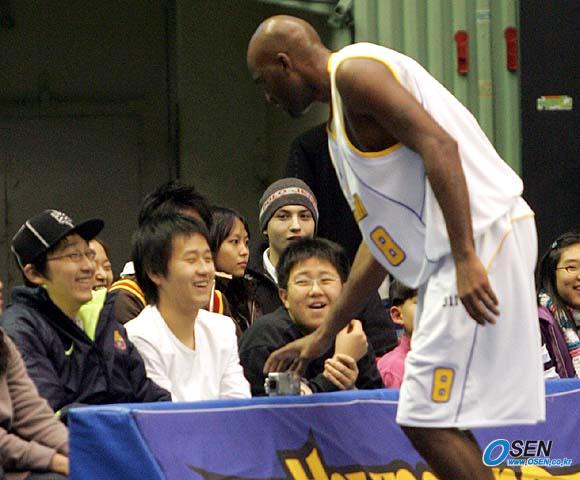 5일 잠실체육관에서 벌어진 2005~2006 KCC 프로농구 서울 삼성과 부산 KTF의 경기 1쿼터서 경기가 잠시 중단됐을 때 삼성의 네이트 존슨이 관중이 광고판 위에 올려 놓은 디지털카메라를 잠시 들었다 내려놓고 있다./잠실체=손용호 기자 spjj@osen.co.kr [Copyright ⓒ 한국 최고의 스포츠 전문 미디어 OSEN(www.osen.co.kr) 무단전재 및 재배포 금지]