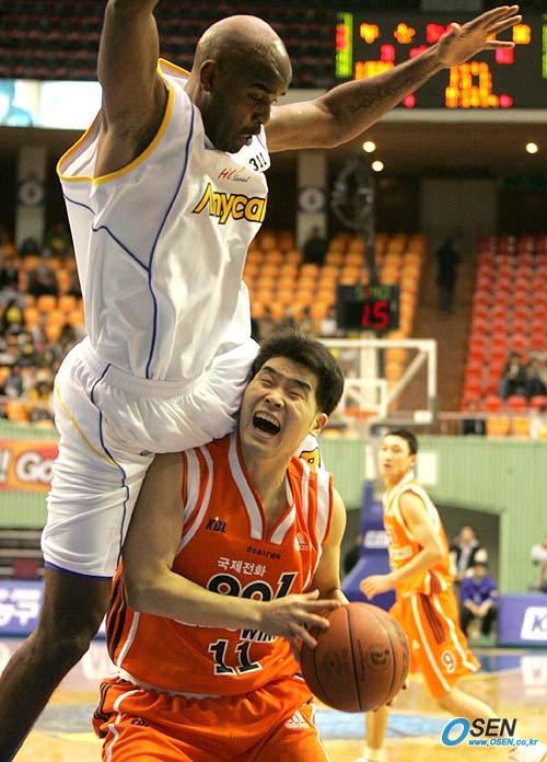 5일 잠실체육관에서 벌어진 2005~2006 KCC 프로농구 서울 삼성과 부산 KTF의 경기 1쿼터서 삼성의 네이트 존슨이 블로킹을 노리다가 페이크 동작에 속아 KTF 조상현의 몸 위로 올라타고 있다./잠실체=손용호 기자spjj@osen.co.kr [Copyright ⓒ 한국 최고의 스포츠 전문 미디어 OSEN(www.osen.co.kr) 무단전재 및 재배포 금지]
