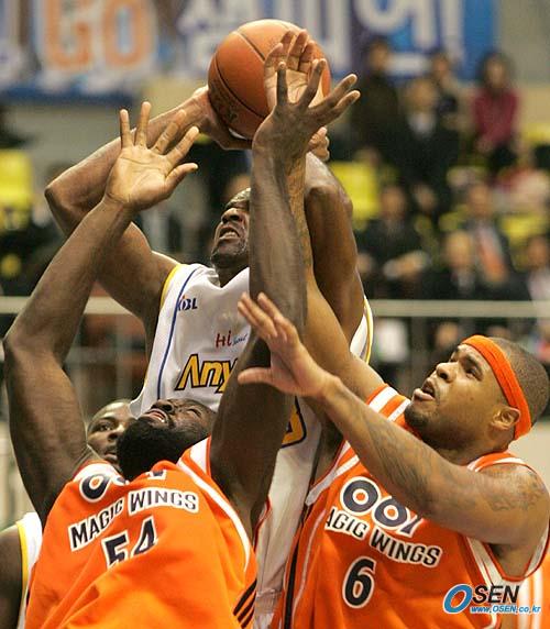 5일 잠실체육관에서 벌어진 2005~2006 KCC 프로농구 서울 삼성과 부산 KTF의 경기 4쿼터서 삼성의 네이트 존슨이 KTF 애런 맥기(왼쪽)와 나이젤 딕슨 위에서 리바운드를 잡아내고 있다. 존슨의 오른쪽 뒤는 올루미데 오예데지./잠실체=손용호 기자 spjj@osen.co.kr [Copyright ⓒ 한국 최고의 스포츠 전문 미디어 OSEN(www.osen.co.kr) 무단전재 및 재배포 금지]