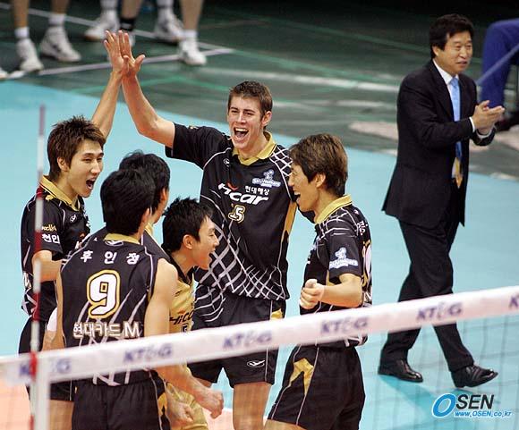 8일 대전 충무체육관에서 벌어진 KT&G 2005~2006 V리그 대전 삼성화재와 천안 현대캐피탈의 경기서 3-0으로 완승한 현대캐피탈 선수들이 코트 중앙에 모여 승리의 기쁨을 나누고 있다./대전=손용호 기자spjj@osen.co.kr [Copyright ⓒ 한국 최고의 스포츠 전문 미디어 OSEN(www.osen.co.kr) 무단전재 및 재배포 금지]