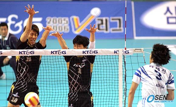 8일 대전 충무체육관에서 벌어진 KT&G 2005~2006 V리그 대전 삼성화재와 천안 현대캐피탈의 경기서 현대캐피탈이 3-0으로 완승, 11연승을 이어갔다. 2세트서 현대캐피탈의 윤봉우(왼쪽)가 송인석과 함께 점프, 삼성화재 김세진의 크로스 공격을 블로킹, 득점을 올리고 있다./대전=손용호 기자 spjj@osen.co.kr [Copyright ⓒ 한국 최고의 스포츠 전문 미디어 OSEN(www.osen.co.kr) 무단전재 및 재배포 금지]