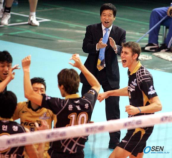 8일 대전 충무체육관에서 벌어진 KT&G 2005~2006 V리그 대전 삼성화재와 천안 현대캐피탈의 경기서 현대캐피탈이 3-0으로 완승, 11연승을 이어갔다. 3세트서 숀 루니의 공격이 성공하며 승세가 굳어지자 김호철 현대캐피탈 감독이 박수를 치며 선수들을 격려하고 있다./대전=손용호 기자 spjj@osen.co.kr [Copyright ⓒ 한국 최고의 스포츠 전문 미디어 OSEN(www.osen.co.kr) 무단전재 및 재배포 금지]