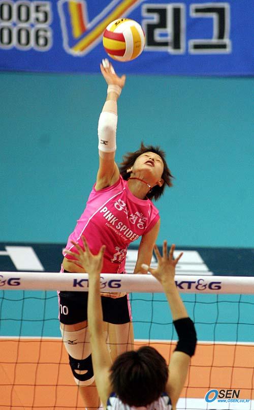 8일 대전 충무체육관에서 벌어진 KT&G 2005~2006 V리그 KT&G와 흥국생명의 여자부 경기서 흥국생명의 신인 거포 김연경이 KT&G 지정희의 블로킹 위로 백어택을 성공시키고 있다./대전=손용호 기자 spjj@osen.co.kr [Copyright ⓒ 한국 최고의 스포츠 전문 미디어 OSEN(www.osen.co.kr) 무단전재 및 재배포 금지]
