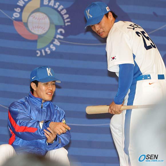 한국야구위원회는 9일 오후 서울 잠실 롯데월드호텔서 오는 3월 일본 도쿄돔에서 벌어지는 WBC 1라운드에 출전할 한국대표팀 오리엔테이션 및 미디어데이 행사를 가졌다. 유니폼 발표식에서 이승엽이 바로 들어가자 김병현이 한 번 더 갔다오라고 손짓하고 있다 ./손용호 기자 spjj@osen.co.kr [Copyright ⓒ 한국 최고의 스포츠 전문 미디어 OSEN(www.osen.co.kr) 무단전재 및 재배포 금지]