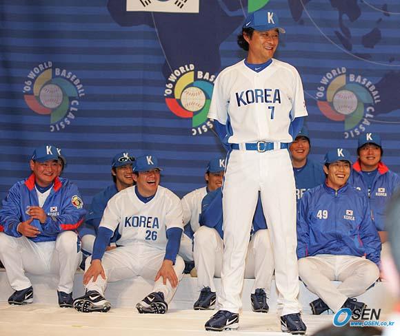 한국야구위원회는 9일 오후 서울 잠실 롯데월드호텔서 오는 3월 일본 도쿄돔에서 벌어지는 WBC 1라운드에 출전할 한국대표팀 오리엔테이션 및 미디어데이 행사를 가졌다. 유니폼 발표식에서 이병규가 멋진 폼을 잡자 뒤에 서 있던 이종범 등이 웃고 있다./손용호 기자 spjj@osen.co.kr [Copyright ⓒ 한국 최고의 스포츠 전문 미디어 OSEN(www.osen.co.kr) 무단전재 및 재배포 금지]