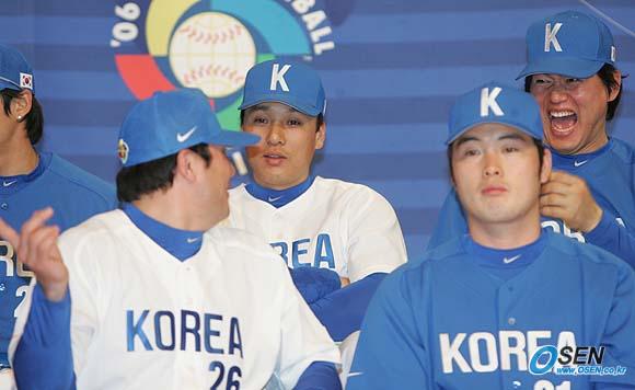 한국야구위원회는 9일 오후 서울 잠실 롯데월드호텔서 오는 3월 일본 도쿄돔에서 벌어지는 WBC 1라운드에 출전할 한국대표팀 오리엔테이션 및 미디어데이 행사를 가졌다. 기자회견 중 서재응의 무슨 얘기를 했는지 최희섭이 입을 크게 벌리고 웃고 있다./손용호 기자 spjj@osen.co.kr [Copyright ⓒ 한국 최고의 스포츠 전문 미디어 OSEN(www.osen.co.kr) 무단전재 및 재배포 금지]