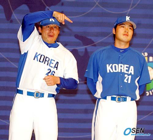 한국야구위원회는 9일 오후 서울 잠실 롯데월드호텔서 오는 3월 일본 도쿄돔에서 벌어지는 WBC 1라운드에 출전할 한국대표팀 오리엔테이션 및 미디어데이 행사를 가졌다. 정대현(오른쪽)과 나란히 서 있던 서재응이 앞쪽에 손짓으로 사인을 보내고 있다./손용호 기자 spjj@osen.co.kr [Copyright ⓒ 한국 최고의 스포츠 전문 미디어 OSEN(www.osen.co.kr) 무단전재 및 재배포 금지]