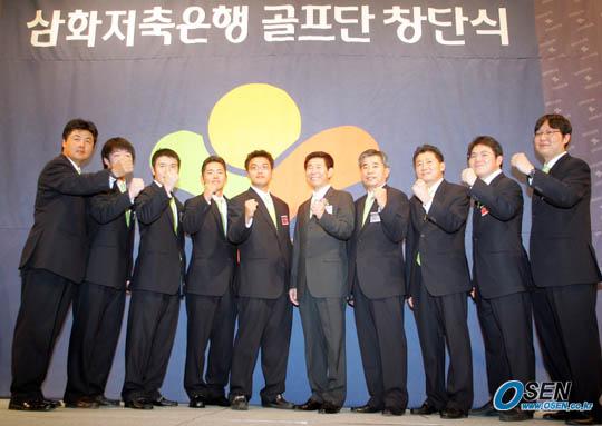 삼화저축은행(회장 신삼길)이 남자 프로골프 유망주들을 대거 영입, 10일 서울 논현동 임페리얼 팰리스호텔에서 골프단 창단식을 가졌다. 신삼길 구단주, 박재영 단장, 김형신 감독, 배성재 주무가 선수들과 함께 기념 사진을 찍고 있다./주지영 기자 jj0jj0@osen.cp.kr [Copyright ⓒ 한국 최고의 스포츠 전문 미디어 OSEN(www.osen.co.kr) 무단전재 및 재배포 금지]