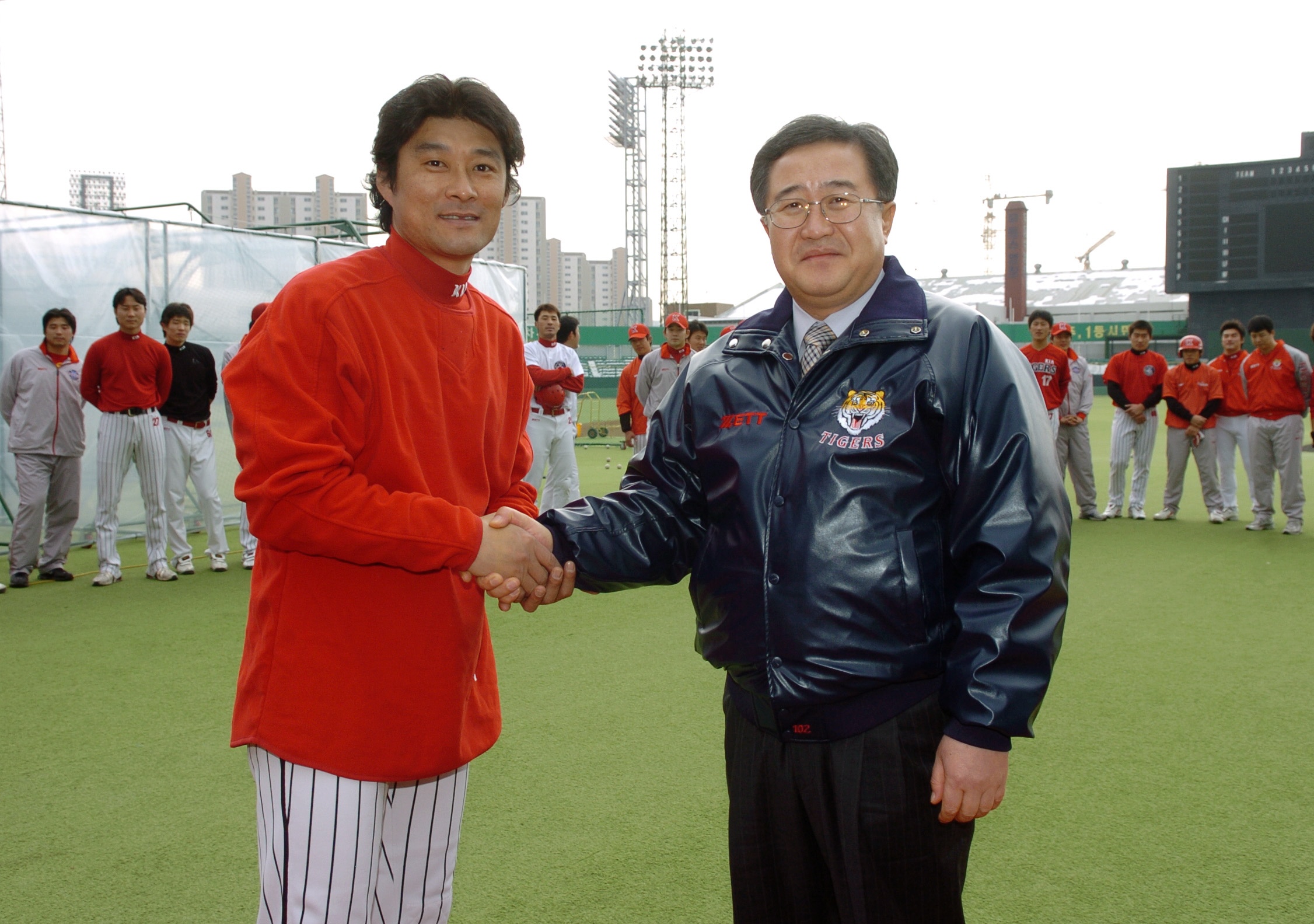 조남홍 기아 타이거즈 신임 사장 겸 구단주 대행이 12일 광주 무등구장을 방문, 훈련 중인 선수단과 상견례를 했다. 조 사장은 "자신이 희생하며 팀워크를 이뤄 색깔이 뚜렷한 야구를 펼치자"며 "코칭스태프와 프런트는 선수들이 훈련에만 전념할 수 있도록 지원을 아끼지 않을테니 선수들도 좋은 경기를 펼쳐달라"고 당부했다. 주장 이종범은 "지난해 같은 수모는 당하지 않도록 선수들이 똘똘뭉쳐 이기는 야구를 선보이겠다"고 답했다. 조 사장이 이종범과 악수를 나누는 모습./기아 타이거즈 [Copyright ⓒ 한국 최고의 스포츠 전문 미디어 OSEN(www.osen.co.kr) 무단전재 및 재배포 금지]