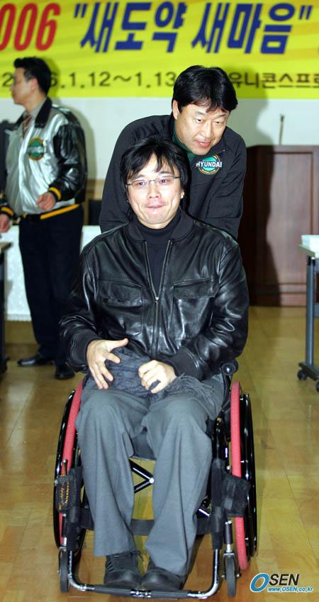 12일 저녁 고양의 현대 유니콘스 원당 구장에서 '2006 새도약 새마음 결의대회'가 열렸다. 김재박 감독이 현대 선수들에게 특별 강의를 마친 전 클론 멤버 강원래의 휠체어를 밀어주고 있다./고양=주지영 기자 jj0jj0@osen.co.kr [Copyright ⓒ 한국 최고의 스포츠 전문 미디어 OSEN(www.osen.co.kr) 무단전재 및 재배포 금지]