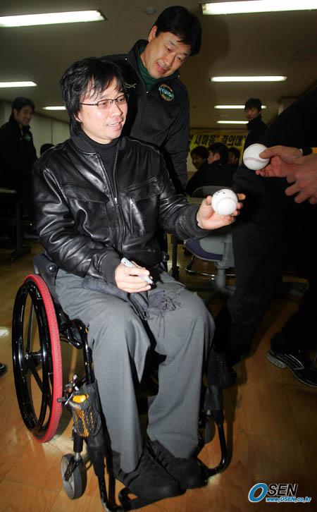 12일 저녁 고양의 현대 유니콘스 원당 구장에서 '2006 새도약 새마음 결의대회'가 열렸다. 현대 선수들에게 특별 강연을 한 전 클론 멤버 강원래가 야구공에 사인해 유니콘스 직원에게 건네주며 웃고 있다./고양=주지영 기자 jj0jj0@osen.co.kr [Copyright ⓒ 한국 최고의 스포츠 전문 미디어 OSEN(www.osen.co.kr) 무단전재 및 재배포 금지]
