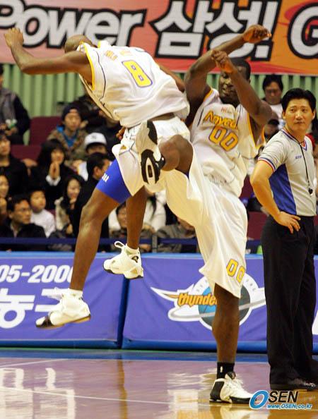 14일 잠실체육관에서 벌어진 2005~2006 KCC 프로농구 서울 삼성과 전주 KCC의 경기서 79-71로 승리한 삼성의 네이트 존슨(왼쪽)과 올루미데 오예데지가 독특한 세리머니를 펼치고 있다./잠실체=주지영 기자 jj0jj0@osen.co.kr [Copyright ⓒ 한국 최고의 스포츠 전문 미디어 OSEN(www.osen.co.kr) 무단전재 및 재배포 금지]