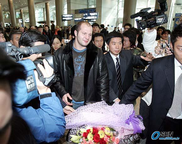 세계 격투기의 황제인 '얼음 주먹' 표도르 에밀리아넨코가 18일 오전 러시아 고유 호신술인 삼보 홍보를 위해 인천공항을 통해 입국했다. 표도르가 많은 취재진과 팬들에 둘러싸여 입국장을 나서고 있다./인천공항=손용호 기자 spjj@osen.co.kr [Copyright ⓒ 한국 최고의 스포츠 전문 미디어 OSEN(www.osen.co.kr) 무단전재 및 재배포 금지]