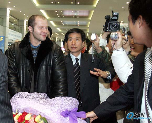 세계 격투기의 황제인 '얼음 주먹' 표도르 에밀리아넨코가 18일 오전 러시아 고유 호신술인 삼보 홍보를 위해 인천공항을 통해 입국했다. 주차장으로 이동하던 표도르가 팬들이 사진을 찍으려 하자 잠시 발걸음을 멈추고 포즈를 취해주고 있다./인천공항=손용호 기자 spjj@osen.co.kr [Copyright ⓒ 한국 최고의 스포츠 전문 미디어 OSEN(www.osen.co.kr) 무단전재 및 재배포 금지]