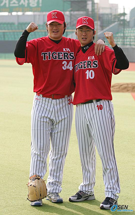 기아 타이거즈가 17일 오후 광주 무등경기장에서 신입단 선수 및 배번 변경 선수들의 포토데이 행사를 가졌다.에이스 김진우(왼쪽)가 '슈퍼 루키' 한기주와 함께 파이팅을 외치고 있다. 김진우는 글러브를 발등 위에 올려놓으며 애지중지하고 있다./광주=박영태 기자 ds3fan@osen.co.kr [Copyright ⓒ 한국 최고의 스포츠 전문 미디어 OSEN(www.osen.co.kr) 무단전재 및 재배포 금지]