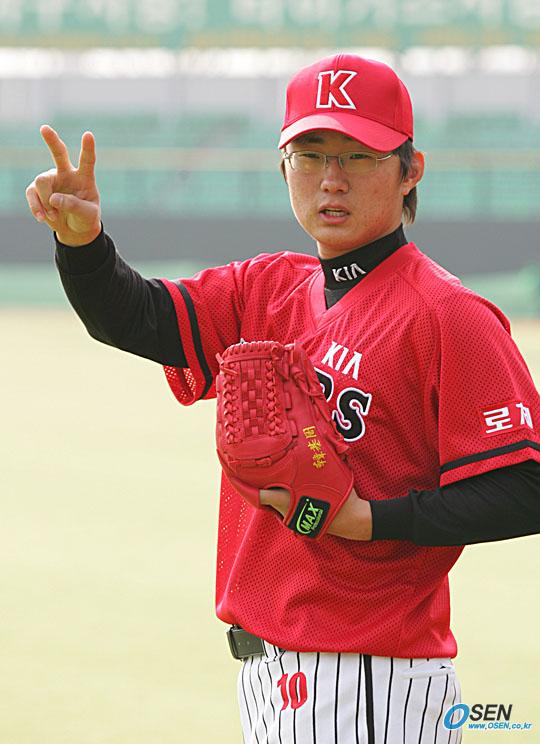 기아 타이거즈가 17일 오후 광주 무등경기장에서 신인 및 배번이 변경된 선수들의 포토데이 행사를 가졌다. 프로야구 사상 최고액인 10억 원의 계약금을 받고 입단한 한기주가 손으로 V자를 그려 보이고 있다./광주=박영태 기자 ds3fan@osen.co.kr [Copyright ⓒ 한국 최고의 스포츠 전문 미디어 OSEN(www.osen.co.kr) 무단전재 및 재배포 금지]