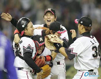 롯데 마린스가 지난해 포스트시즌 9연승 기록을 기네스북에 올리는 절차를 밟고 있다고 이 18일 보도했다. 롯데는 지난해 10월 17일 퍼시픽리그 챔피언결정전에서 소프트뱅크 호크스에 3-2로 승리한 뒤 11월 13일 코나미컵 아시아시리즈 삼성과 결승전(5-3승)까지 9경기에서 연속 승리를 거뒀다. 롯데는 이렇게 거둔 9연승이 2004년 보스턴 레드삭스, 2005년 시카고 화이트삭스가 세운 포스트시즌 8연승 기록을 경신한 세계기록으로 해석하고 있다. 구단 관계자는 “새로 생긴 아시아시리즈가 어떤 판단을 받을지 모르지만 조사해 보고 싶었다”고 밝혔다. 실제로 롯데는 지난해 연말 영국의 기네스 월드 레코드사에 이 같은 내용을 전하고 기네스북 등재 여부를 타진하는 e-메일을 보낸 상태. 현재 회신을 기다리고 있는 중이다. 일본 스포츠계에서 기네스북에 오른 기록은 적지 않다. 대표적으로 왕정치 감독이 868개의 홈런기록이 올라있다. 88세에 메이지대학 럭비 감독을 맡았던 고(故) 기타지마 감독은 최고령 감독으로 기네스북에 들어갔고 나카타의 4경기 연속 해트트릭 기록도 인정받았다. 2003 시즌을 마친 뒤에는 당시 요미우리 자이언츠 내야수 가와이 마사히로(현 주니치)의 개인통산 최다 희생번트 기록이 기네스북에 오르기도 했다. 당시 가와이는 개인통산 512개의 보내기 번트를 성공시켜 메이저리그에서 뛰었던 에디 콜린스의 511개를 앞지르고 세계기록을 세운 것으로 인정받았다. 1964년 생인 가와이는 2004년 6개, 그리고 작년에 7개의 희생번트를 추가, 이 부문 신기록 행진을 계속하고 있다. 박승현 기자 nanga@osen.co.kr 지난해 코마니컵 결승서 승리한 뒤 좋아하는 롯데 선수들 [Copyright ⓒ 한국 최고의 스포츠 전문 미디어 OSEN(www.osen.co.kr) 무단전재 및 재배포 금지]