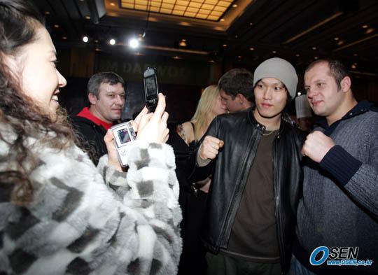 종합격투기 세계 최강 표도르 에밀리아넨코가 러시아 호신술인 삼보 홍보를 위해 동생 알렉산더와 함께 18일 내한했다. 표도르가 이날 저녁 서울 홍은동 그랜드 힐튼 호텔에서 열린 GM대우 자동차 TOSCA 신차발표회장을 방문, 팬과 기념 촬영하고 있는 뒤로 동생 부부는 키스를 나누고 있다. /주지영 기자 jj0jj0@osen.co.kr [Copyright ⓒ 한국 최고의 스포츠 전문 미디어 OSEN(www.osen.co.kr) 무단전재 및 재배포 금지]