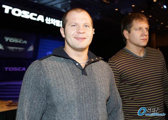 종합격투기 세계 최강 표도르 에밀리아넨코가 러시아 호신술인 삼보 홍보를 위해 동생 알렉산더와 함께 18일 오전 내한, 저녁에는 서울 홍은동 그랜드 힐튼 호텔에서 열린 GM대우 자동차 TOSCA 신차발표회장을 찾았다. 표도르(왼쪽)가 알렉산더와 주위를 둘러보고 있다. /주지영 기자 jj0jj0@osen.co.kr [Copyright ⓒ 한국 최고의 스포츠 전문 미디어 OSEN(www.osen.co.kr) 무단전재 및 재배포 금지]