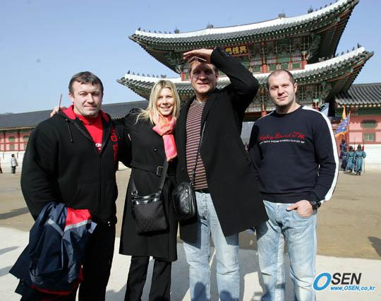 러시아 호신술인 삼보 홍보를 위해 동생 알렉산더 부부와 함께 내한한 세계 종합격투기의 최강자 표도르 에밀리아넨코가 19일 오후 경복궁을 찾았다. 표도르 형제 일행이 경복궁을 배경으로 포즈를 취하고 있다./주지영 기자 jj0jj0@osen.co.kr [Copyright ⓒ 한국 최고의 스포츠 전문 미디어 OSEN(www.osen.co.kr) 무단전재 및 재배포 금지]