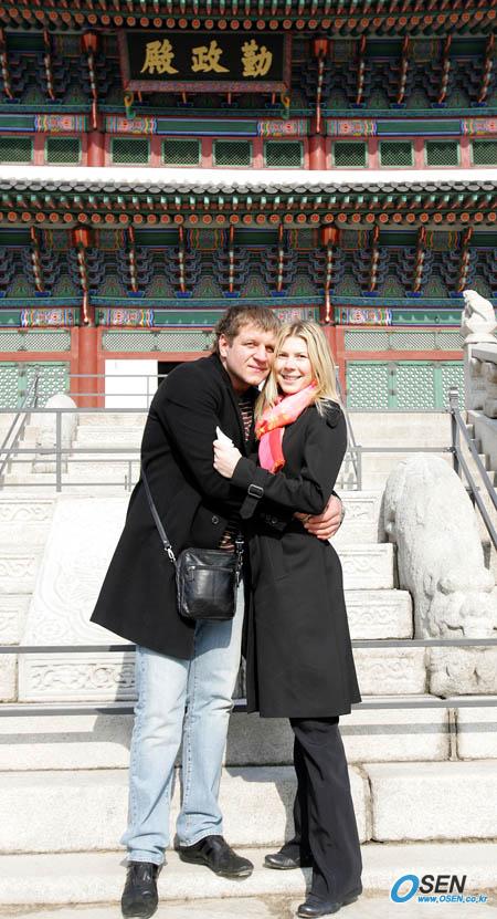 러시아 호신술인 삼보 홍보를 위해 내한한 세계 종합격투기의 최강자 표도르 에밀리아넨코 형제가 19일 오후 경복궁을 찾았다. 신혼인 동생 알렉산더가 아내와 함께 다정한 포즈를 취하고 있다./주지영 기자 jj0jj0@osen.co.kr [Copyright ⓒ 한국 최고의 스포츠 전문 미디어 OSEN(www.osen.co.kr) 무단전재 및 재배포 금지]