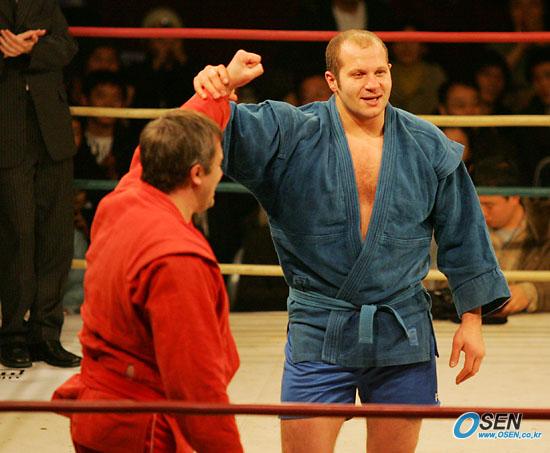 20일 경남대학교 실내체육관에서 '얼음 주먹' 표도르 에밀리아넨코가 블라디미르 보르노프를 상대로 시범을 보였다. 표도르가 시범경기를 마친 뒤 스승인 트레이너의 손을 들어주며 예의를 표시하고 있다./마산=박영태 기자 ds3fan@osen.co.kr [Copyright ⓒ 한국 최고의 스포츠 전문 미디어 OSEN(www.osen.co.kr) 무단전재 및 재배포 금지]