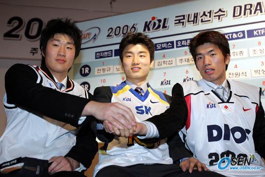 2006 프로농구 신인 드래프트가 20일 오후 서울 양재동 교육문화회관에서 열렸다. 1라운드 1,2,3위로 지명된 전자랜드의 전정규, SK의 노경석, LG의 이현민(왼쪽으로부터)이 파화이팅을 외치고 있다./주지영 기자 jj0jj0@osen.co.kr [Copyright ⓒ 한국 최고의 스포츠 전문 미디어 OSEN(www.osen.co.kr) 무단전재 및 재배포 금지]