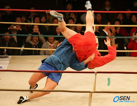 20일 마산 경남대학교 실내체육관에서 세계 종합격투기의 황제인 표도르 에밀리아넨코가 블라디미르 보르노프 트레이너를 상대로 시범을 보였다. 표도르가 보르노프 트레이너를 내던지고 있다. /마산=박영태 기자 ds3fan@osen.co.kr [Copyright ⓒ 한국 최고의 스포츠 전문 미디어 OSEN(www.osen.co.kr) 무단전재 및 재배포 금지]