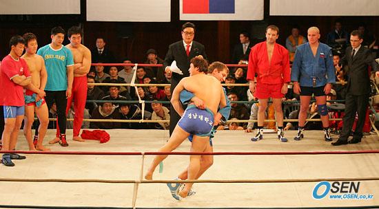 20일 마산 경남대학교 실내체육관에서 세계 종합격투기의 황제인 표도르 에밀리아넨코가 블라디미르 보르노프 트레이너를 상대로 시범을 보이기에 앞서 동생 알렉산더가 경남대 씨름 선수와 약식으로 경기를 하고 있다./마산=박영태 기자 ds3fan@osen.co.kr [Copyright ⓒ 한국 최고의 스포츠 전문 미디어 OSEN(www.osen.co.kr) 무단전재 및 재배포 금지]