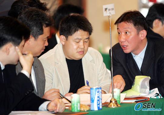 2006 프로농구 신인 드래프트가 20일 오후 서울 양재동 교육문화회관에서 열렸다. 1라운드 지명을 마친 허재 KCC 감독(오른쪽)이 2라운드에 들어가기 전 원주 동부 자리로 가서 강동희 코치(가운데) 전창진 감독(왼쪽에서 두 번째) 등과 감독 옆으로 가서 정보를 교환하고 있다. 전 감독이 허 감독의 용산고 2년 선배다./주지영 기자 jj0jj0@osen.co.kr [Copyright ⓒ 한국 최고의 스포츠 전문 미디어 OSEN(www.osen.co.kr) 무단전재 및 재배포 금지]