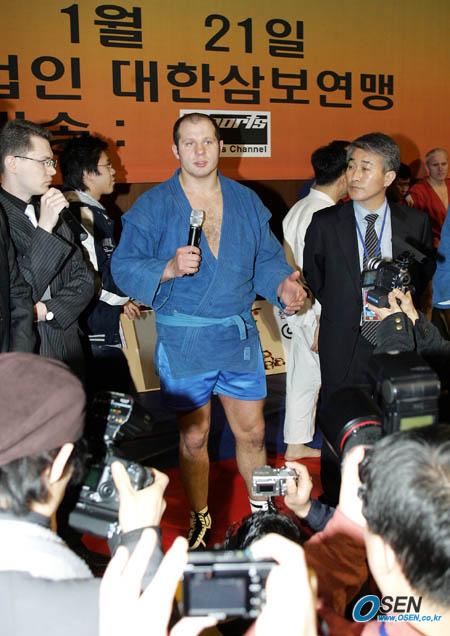 21일 오후 서울 올림픽공원 역도경기장에서 열린 '2006 삼보 페스티벌'에 초청된 세계 종합격투기의 최강자 표도르 에밀리아넨코가 삼보 세미나 참석자들에게 시범을 보인 후 인터뷰하고 있다./올림픽공원=박영태 기자 ds3fan@osen.co.kr [Copyright ⓒ 한국 최고의 스포츠 전문 미디어 OSEN(www.osen.co.kr) 무단전재 및 재배포 금지]